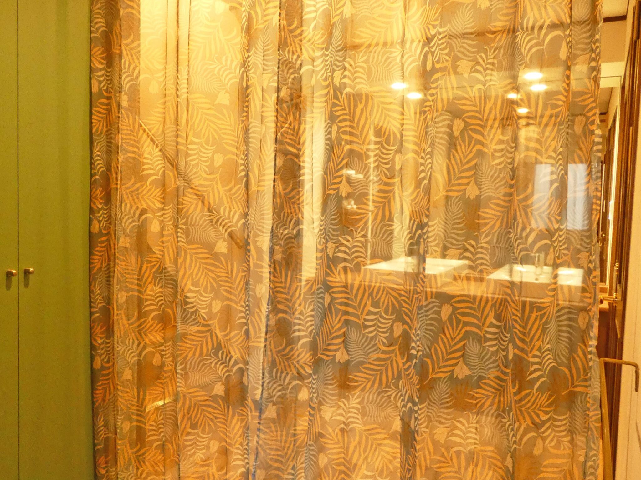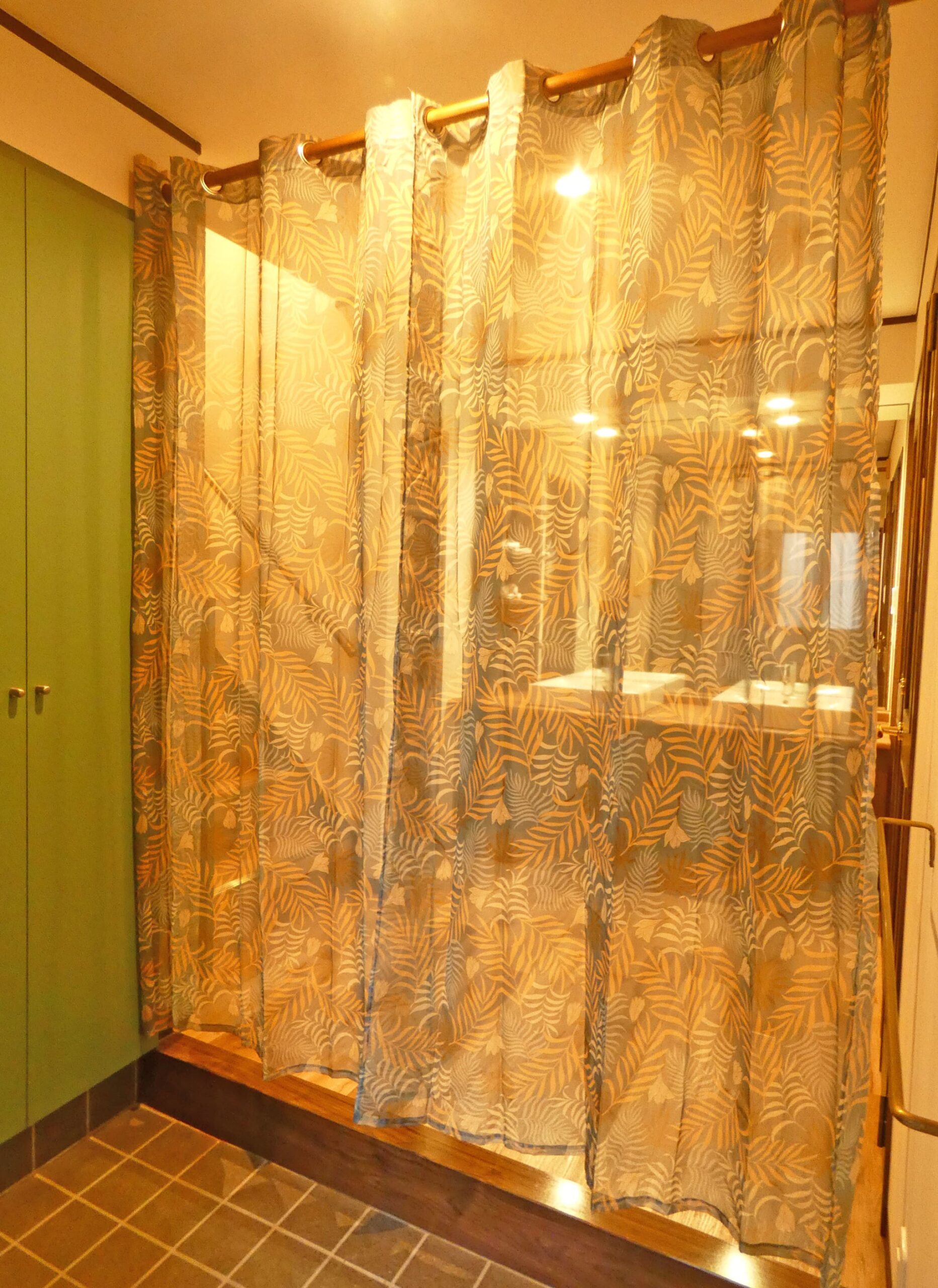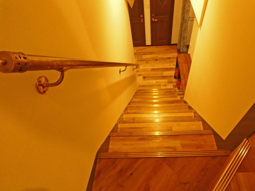 室内はリノベーションされたばかりで、ステンドガラスやゴールドの小物が